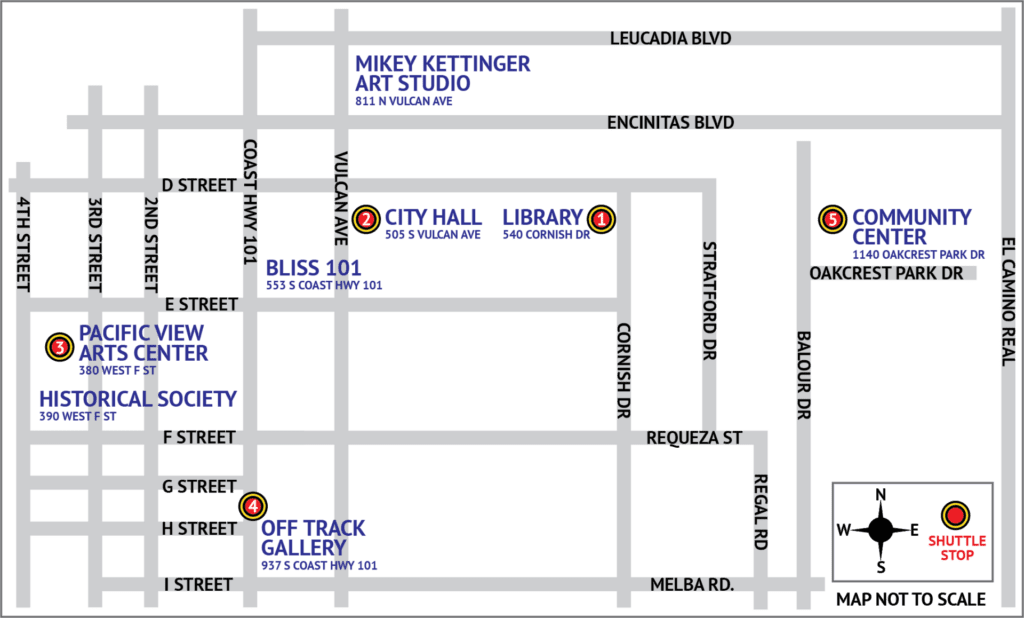 Thanks to funding provided by the San Diego County Library, catch a ride on one of the shuttle buses which will transport you to and from several stops. It’s free! The public is encouraged to park at the Encinitas Community Center and the Encinitas Library to easily access the shuttle.